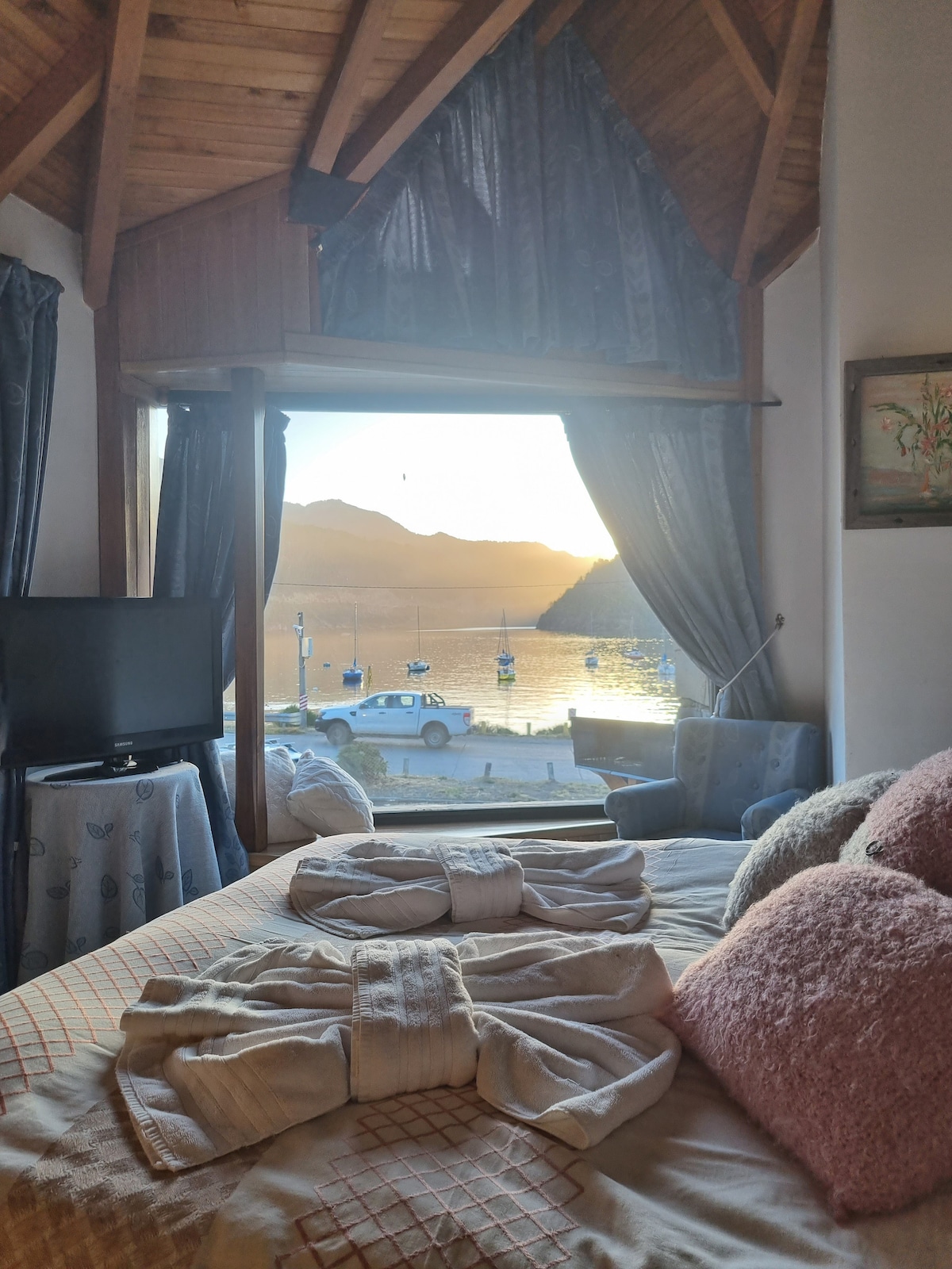 Cálida cabaña de estilo rústico a orillas del lago Nahuel Huapi con hidromasaje, hogar a leña, y deck. Monoambiente creado para el relax y el romanticismo con vista al amanecer y salida de la luna sobre el lago. Smart TV e internet por FIBRA OPTICA con wifi para trabajar. Una kitchinette con todo lo necesario, incluyendo cafetera dolce gusto. Caja de seguridad para resguardar tus notebooks al ir de paseo. Baño completo. Pool, ping-pong. Playa: Kayak y standup paddle. Desayuno continental.