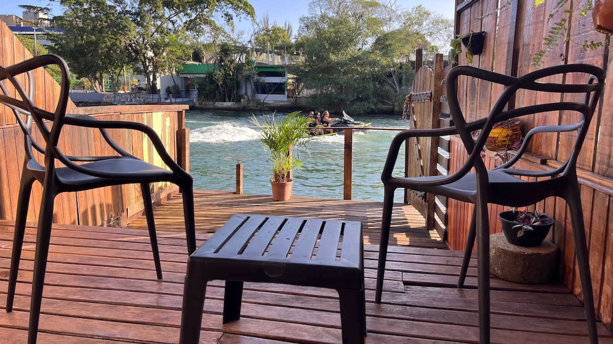 Para quienes buscan una experiencia y no solo un alojamiento. ¡Recargue las energías envuelto de paz y naturaleza en el corazón de Barra, al borde de nuestra Venecia Carioca! ¡Casa con aire de mini resort con muelle privado, parrilla uruguaya, jacuzzi de piedra artificial y chimenea de suelo! ¡Sin comprometer la conectividad física o virtual! Buena conexión a Internet y a 5 minutos en taxi acuático del metro, mercado, tiendas y restaurantes. Numerosas experiencias en la puerta de la casa: alquiler de motos acuáticas, paseos en barco y stand up