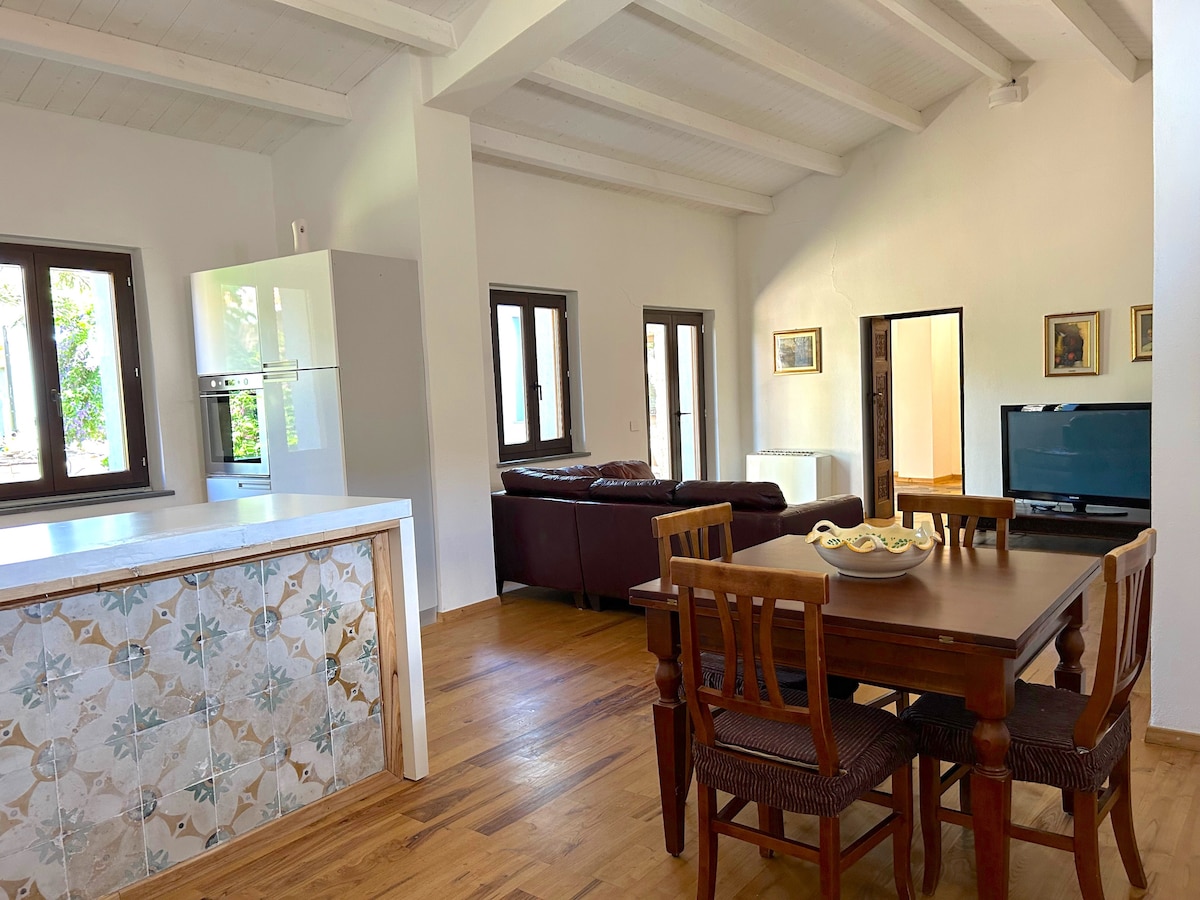 Casa construida según los principios de la bioarquitectura, en madera Xlam con un elevado poder aislante que garantiza un fresco bienestar natural. En el jardín, lleno de flores, rosas y enredaderas aromáticas, un limonero centenario da sombra a la zona dedicada a las comidas al aire libre. En 15 minutos, recorriendo una carretera entre olivares y campos de trigo, se encuentran las encantadoras y vírgenes playas de cuarzo blanco del Área Marina Protegida «Península del Sinis». A su alrededor se encuentran numerosos yacimientos arqueológicos.