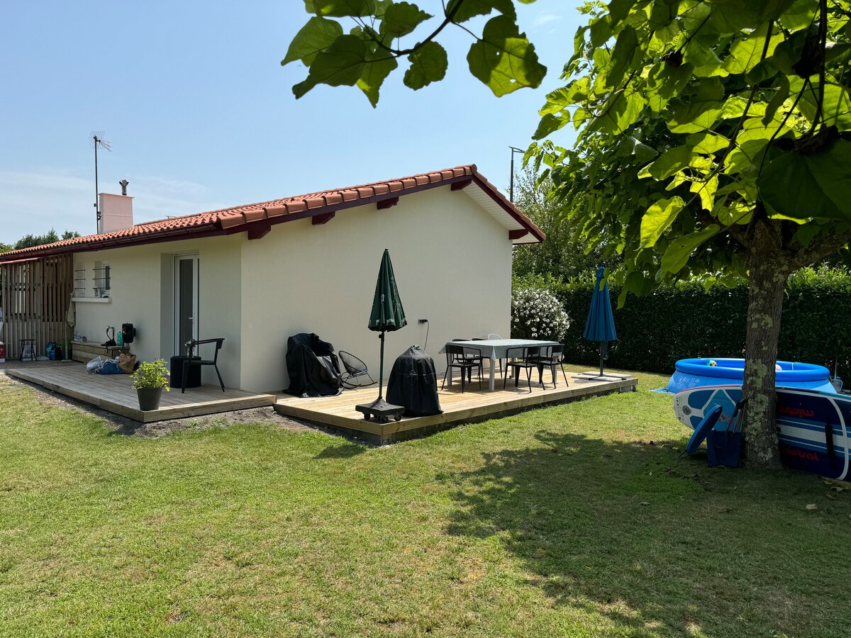Jardín de 1,2 aces en medio de un bosque de pinos cerca de la playa con una piscina privada (4mx12m). Esta casa es perfecta para revitalizarte. Junto a una pista para bicicletas. A 1 minuto de un pequeño y encantador pueblo. A 1 hora de Burdeos y del aeropuerto de Biarritz (esayjet y ryanair desde Londres).