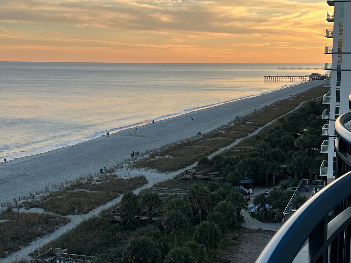 Disfruta de vistas al mar desde un balcón privado. - Cafeteras Keurig K-pod y de filtro. - Cómodo dormitorio: dos acogedoras camas tamaño queen. - Sofá cama: en la sala de estar. -Cocina totalmente equipada. - Smart TV de 55 pulgadas en el salón y el dormitorio. Servicios del centro vacacional: - Piscinas interiores y exteriores. - Jacuzzis - Río lento. - Gimnasio. - Wifi gratuito: mantente conectado. - Acceso directo a la playa - Aparcamiento adjunto disponible. - Ubicación céntrica: - Cerca del paseo marítimo de Myrtle Beach, el SkyWheel y las atracciones locales.