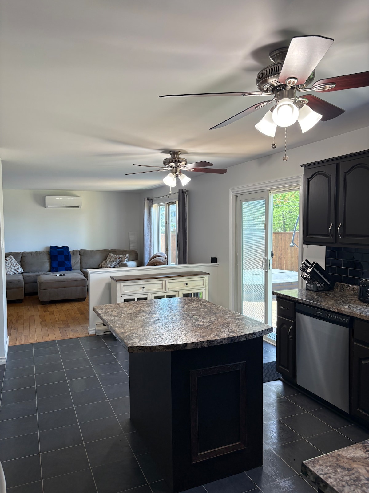Our upstairs, apartment is separate from house and features open concept (600 sq feet) living. Living room with TV and fireplace, Bedroom, Kitchen with island & eating area, desk or vanity, washer & dryer, bathroom with large sit down shower. Quiet neighborhood, lots of trails, shopping and adventures nearby. Magic Mountain, Parlee Beach, 5-8 min to Downtown Moncton - Avenir Centre. 15 min to Airport. 30 min to Shediac or Hopewell Cape Rocks, 1.5 hrs to Fundy National Park. Key code access