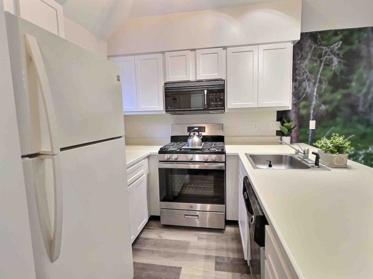 Totalmente renovado en 22/23, un apartamento/condominio de alta gama, moderno y de estilo rústico de 2000 pies cuadrados de planta abierta, con 2 amplias terrazas y espacio al aire libre, con un pozo de fuego y aire acondicionado recién instalado y acceso privado a la bañera de hidromasaje. Perfecto para reuniones familiares y de entretenimiento. La sala de estar, la cocina y el comedor están abiertos con muchos asientos. En verano y otoño, abre las puertas a las amplias cubiertas con una mesa de comedor al aire libre, un sofá y una hamaca. Disfruta del tiempo en familia/con amigos con una fogata en el patio trasero.