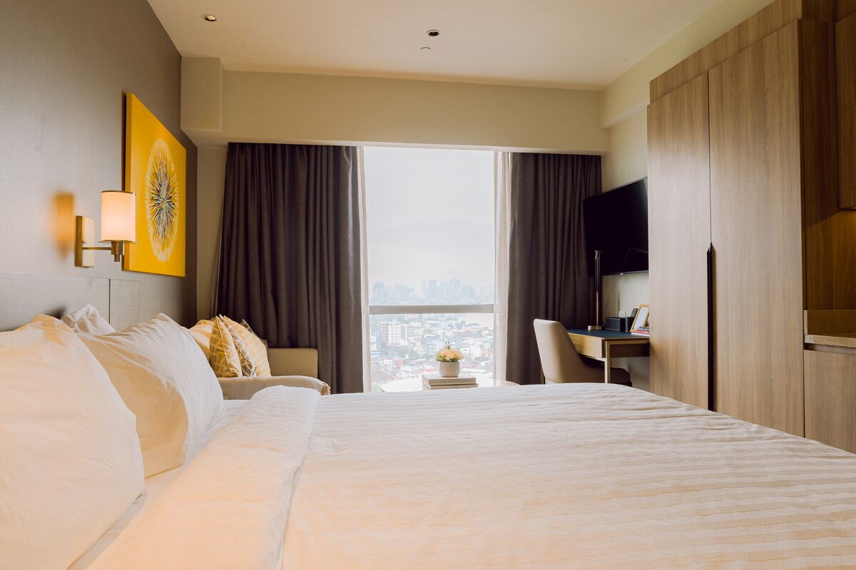 1 dormitorio con vistas a Rockwell Makati por Sage Suite