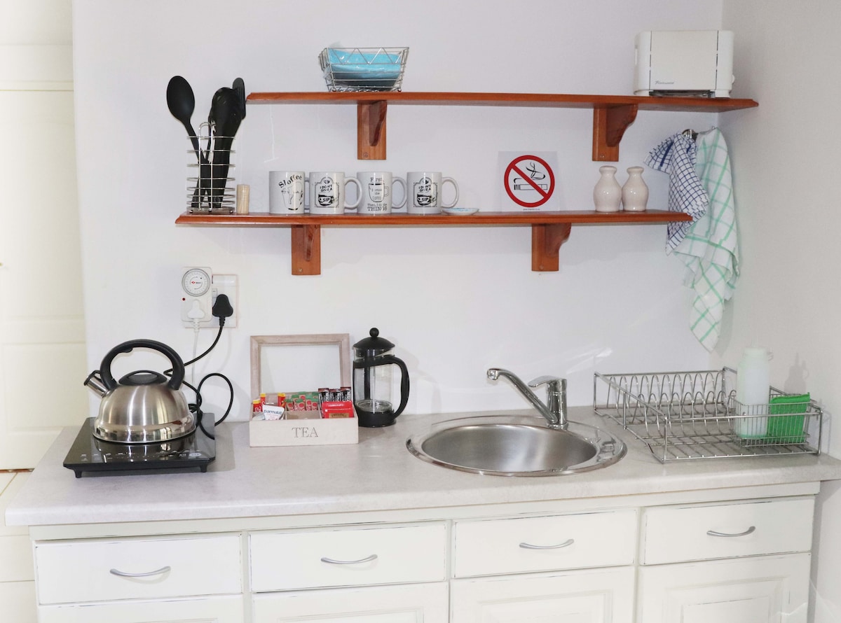 Precioso apartamento tipo estudio en una zona tranquila con armarios empotrados en la zona de la cocina. Disfruta del jardín del bosque de sirenas con sonidos de pájaros y disfruta de una barbacoa típica de estilo sudafricano. Totalmente compatible con la reducción de carga con baterías solares y de respaldo. Sin tiempo de inactividad eléctrica.