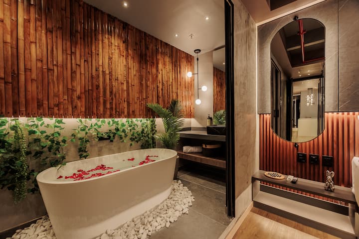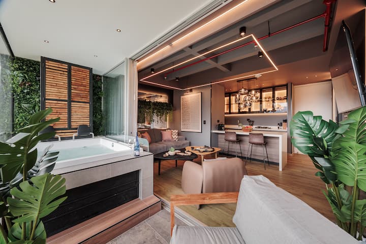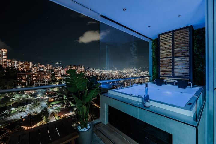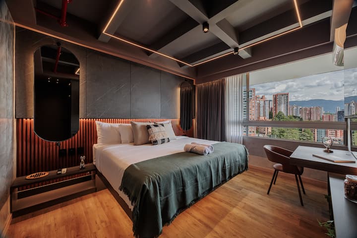 Sal al balcón privado y disfruta del jacuzzi para cuatro, un lugar ideal para relajarte mientras contemplas el impresionante paisaje urbano de las exuberantes montañas verdes de Medellín, un telón de fondo pintoresco que mejora tu experiencia. En el interior, los detalles cuidados, como la iluminación ambiental ajustable con atenuadores y tiras LED, te permiten establecer el ambiente perfecto a cualquier hora.