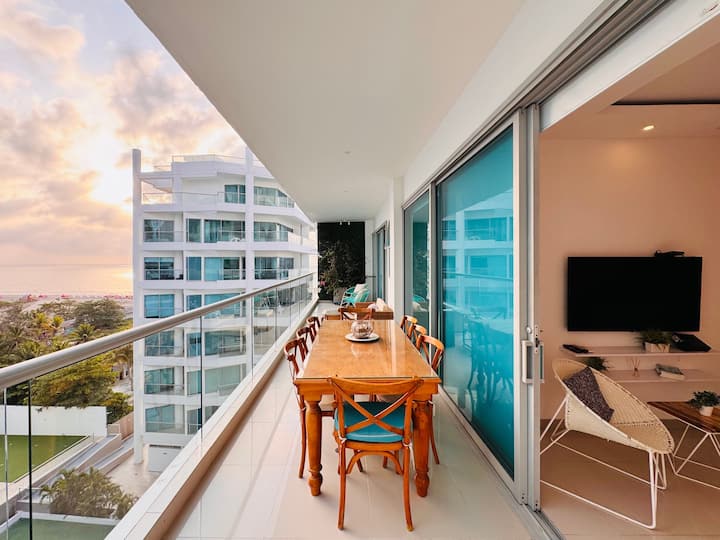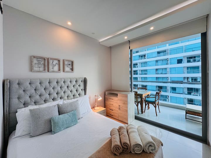 Despiértate con deslumbrantes vistas al mar y atardeceres dorados desde este apartamento frente a la playa dentro del edificio Seaway 935 en el Hotel Sonesta. Relájate en tu balcón privado con una hamaca y una exuberante vegetación, o disfruta del acceso a tres piscinas, jacuzzis, un gimnasio, una pista de tenis y un spa. Perfectamente ubicado cerca de la playa de La Boquilla, a solo 7 minutos de la ciudad amurallada, este elegante refugio combina la comodidad del resort con el encanto costero de Cartagena.