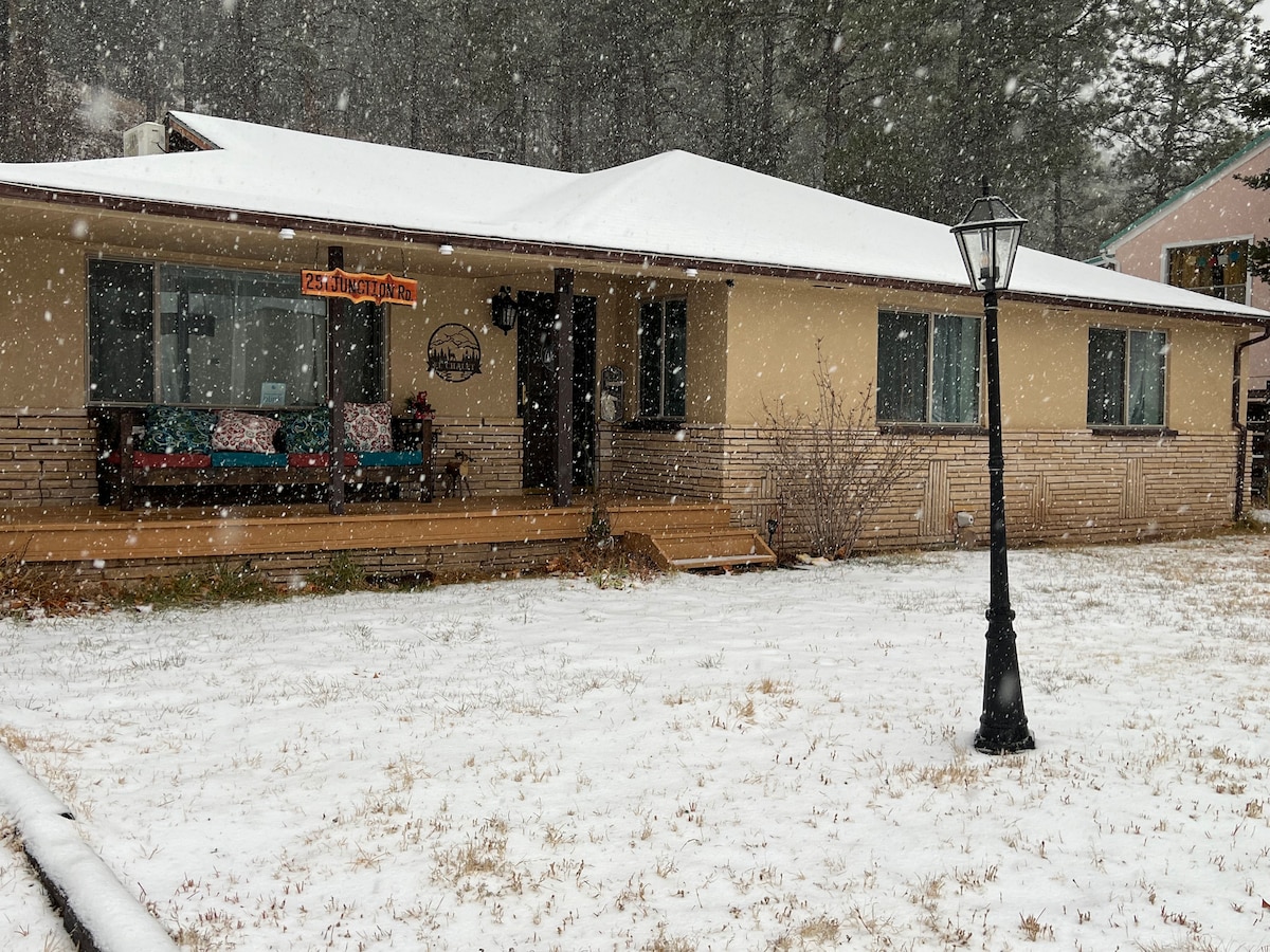 Experimenta la calidez de nuestro acogedor chalet de 2 dormitorios y 1 baño, con dos acogedoras chimeneas, ubicado en el animado centro de Ruidoso y conectado con el Tall Pines Beer and Wine Garden. Te encontrarás a pocos pasos de tiendas encantadoras, bares animados y deliciosas opciones gastronómicas. Relájate en el patio vallado, completo con una relajante bañera de hidromasaje y una práctica parrilla. Además, no dudes en traer a tus amigos peludos por una pequeña tarifa por mascotas. ¡Tenemos muchas ganas de darte la bienvenida a ti y a tus queridos compañeros!
