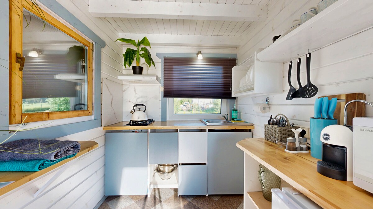 Cabaña pequeña de 2 pisos de planta abierta. Arriba: capacidad para 4 personas (2 colchones) Sofá plegable de 2 pulgadas. Refrigerador, placa de inducción de 2 plazas, horno de cocina, lavavajillas, chimenea, estufa de leña, bomba de calor de fuente de aire. También la casa es cálida en invierno. Duchay calefacción por suelo radiante en el baño. Terraza. Sauna de barril: € 70 extra. Parrilla: trae carbón, otros proporcionados. Parque infantil, cama elástica, columpios, tirolina, casa de juegos, patio para correr. Tenemos un perro pequeño, un mini conejo, pollos. En la casa de al lado viven personas de la familia.