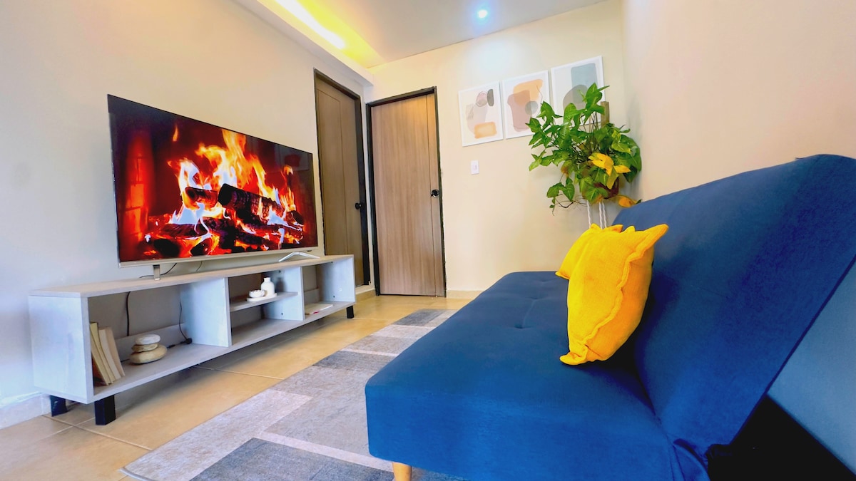 Hermoso apartaestudio, completamente independiente y completamente para el huesped, una cama doble, un sofacama, un baño, aire acondicionado, cocina completa y equipada, barra desayunadora, área de labores con lavadero, nevera, Internet, Televisor Smart, Tvcable, Netflix, Disney+, limpieza semanal gratuita para estancias largas si lo solicita.