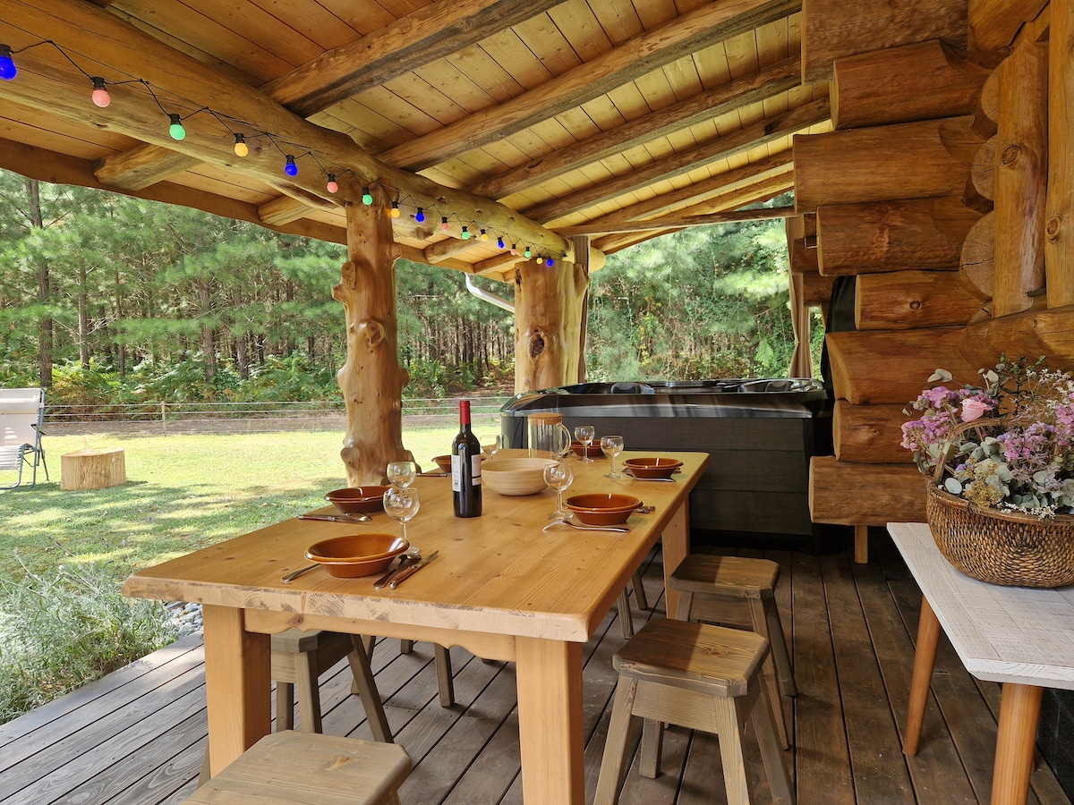 Une cabane dans les arbres tout en bois et intégré dans la nature, avec une terrasse et une passerelle surélevées vous feront découvrir le parc où cerfs et biches demeurent. pour le tarif de 120 e les draps et les serviettes de toilettes son compris dans la location pour 4 personnes avec le petit déjeuner on propose des repas pour le soir servi dans la cabane en supplément 12 e par personnes hors boissons nouveau spa chauffant en supplément de la location de la cabane 6 places
