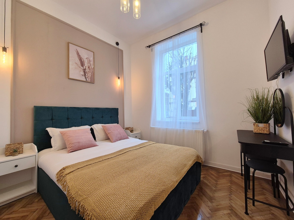 Disfruta de la elegancia y comodidad de esta habitación de lujo en Brasov, a solo 700 metros del centro histórico. La habitación da la bienvenida a sus huéspedes a una chimenea, lo que agrega un toque cálido y agradable al ambiente. Ubicada en el centro histórico, esta habitación es la opción perfecta para aquellos que quieren explorar el encanto de Brasov con facilidad y regresar a la comodidad de una estancia de lujo.