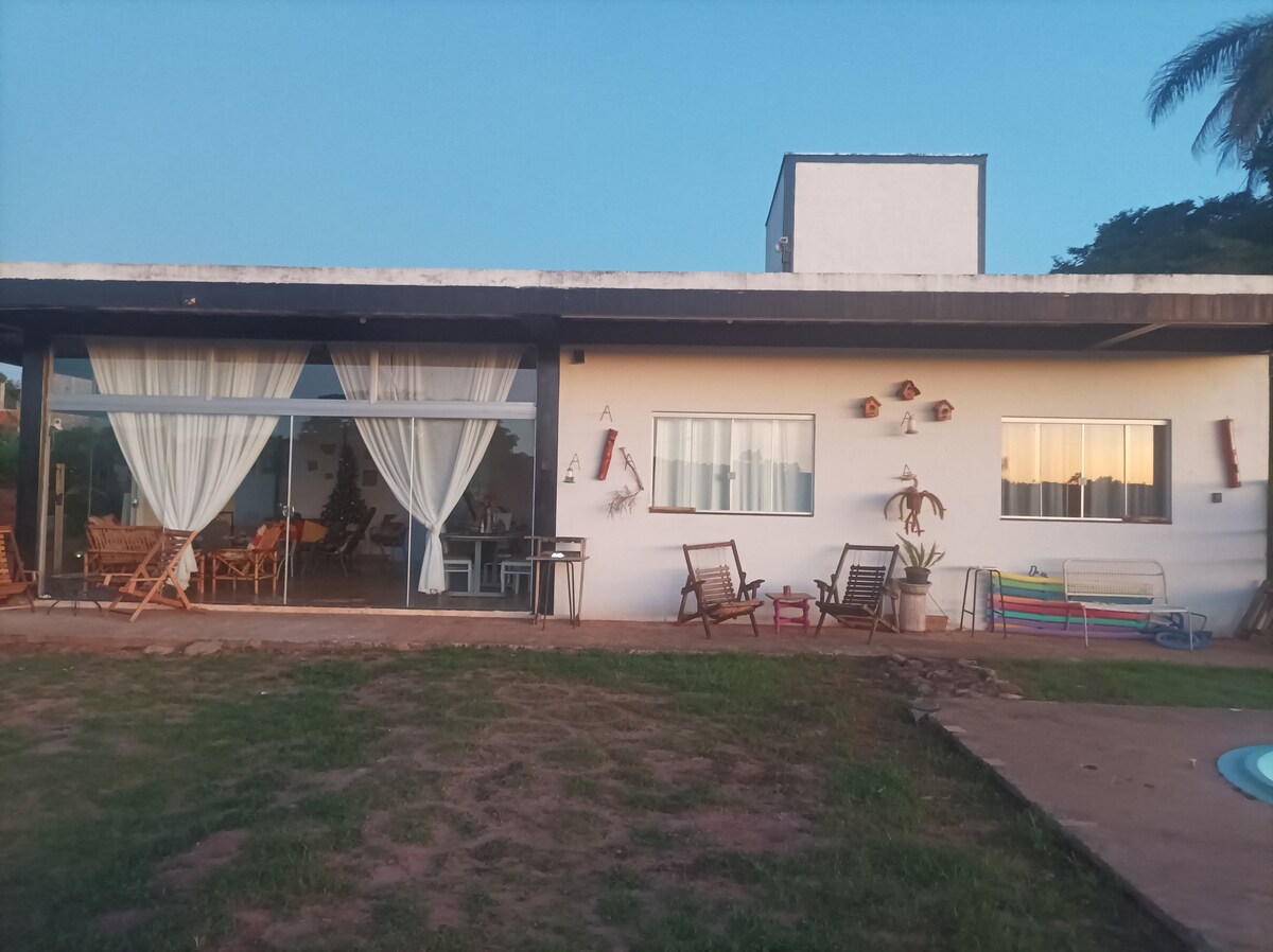 Casa en una estructura metálica, en un condominio cerrado en la zona rural de Araxá. La casa ofrece un amplio espacio de estar (espacio con TV, mesa de comedor, hamaca), cocina, 2 dormitorios ( doble e individual) y un baño básico. Zona exterior: balcón, piscina (6 m) con ducha y jacuzzi. Posible uso de tiendas de campaña. Chacara rodeada de naturaleza verde, aves y flores, fruta en el huerto y algunos condimentos en el jardín, ambos accesibles para los huéspedes. Está a 15 minutos del centro de Araxá.