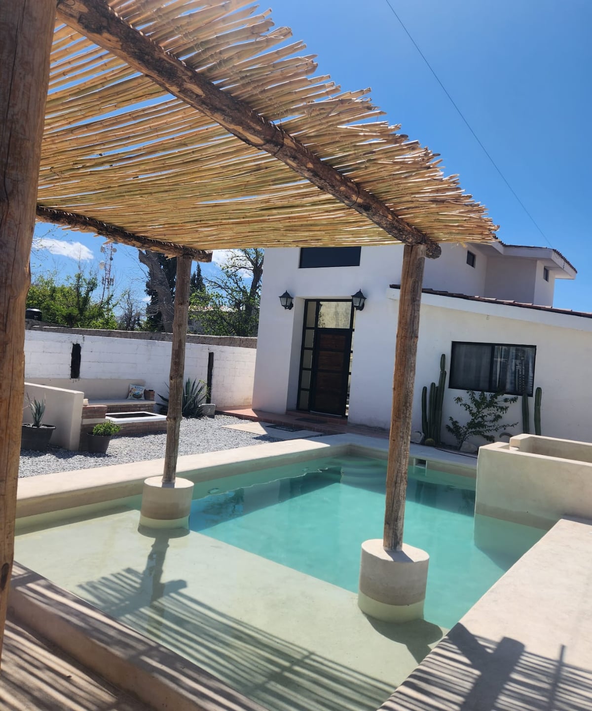 Decorada rustica, pero confortable , pensada para viajeros que gustan de disfrutar el pueblo y la aventura de la naturaleza. Diseñada para disfrutar tanto adentro como fuera de la casa, pero sobre todo para descansar, en espacios amplios e iluminados en compañía de la familia. Gran espacio para los niños! Cuenta con un asador y terraza con una barra para comer en el exterior de la casa. La alberca está a un lado y es COMPARTIDA solo con otra cabaña y hay mesas, sillas, camastros y bancas .