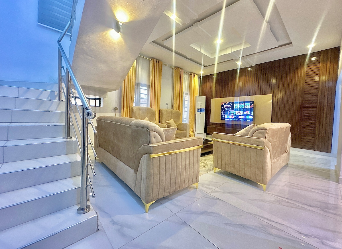 Precio para estancias largas, internet de fibra Wifi, tres (3) aparatos de aire acondicionado, agua caliente, sistema de inversor solar, camas grandes aseguradas, patio trasero privado, estacionamiento privado, cocina espaciosa, parque infantil, TV inteligente, árboles/madera para recoger aire fresco y más. Relájate con toda la familia en este lugar tranquilo. Espacio de trabajo/escritorio adecuado en su lugar. NGN 10,000 unidades de electricidad proporcionadas en el momento del registro, después de lo cual el huésped será responsable del costo de la electricidad.