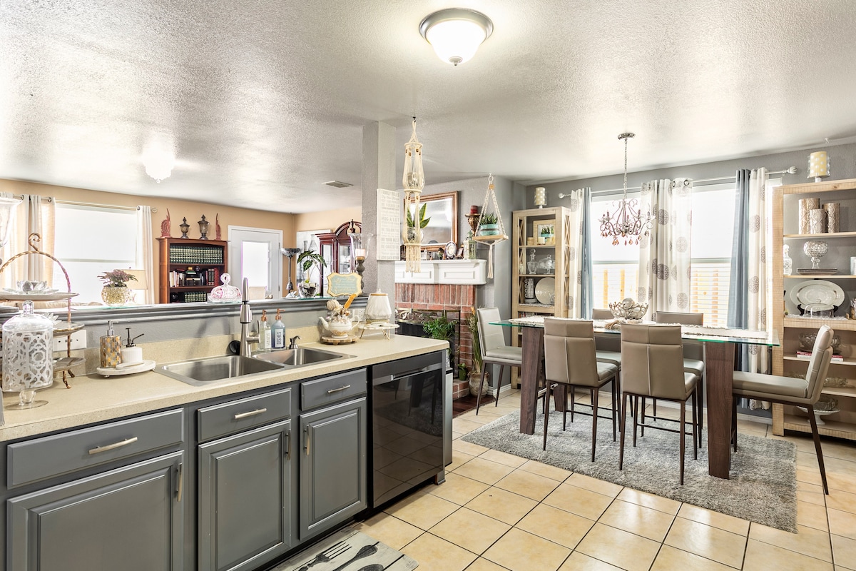 Esta acogedora casa de 2 dormitorios y 2 baños se encuentra justo en el centro del DFW Metroplex, por lo que no está lejos de ningún lugar que quieras visitar. La estación de Tex Rail está a un paso de distancia, por lo que el tren puede llevarte a Dallas o Fort Worth y a muchos lugares intermedios. Pueden dormir cómodamente 6 personas en la cama tamaño king, 2 camas completas y un sofá cama. La cocina está completamente equipada, incluyendo una barra de café para esa taza de café de la mañana. Hay espacio para trabajar con una silla cómoda, y admitimos niños y perros.
