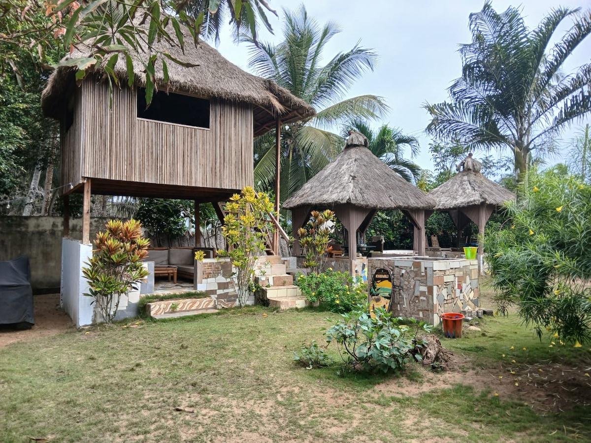 Nuestras cabañas de lujo con estructura de “A” en Aburi son cabañas independientes a las afueras de Acra y a solo 25 km del aeropuerto. Nuestro alojamiento único tiene personalidad propia; en una montaña con vistas a la ciudad. Ofrece impresionantes vistas nocturnas desde tu cama y unas increíbles vistas diurnas de verdes cordilleras y valles. Contemplar la ciudad de noche desde tu propia piscina infinita privada es una experiencia encantadora que complementa nuestro ambiente romántico. Disfruta de una escapada increíble, con más de 15 juegos o caminatas para explorar.