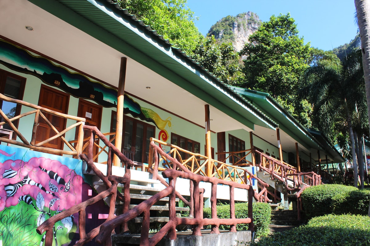 Chill Out Bar and Bungalows is a family-run resort in the jungle, just a 5-minute walk from Tonsai Beach. It has a rustic and authentic vibe, surrounded by towering limestone cliffs and wildlife. As the resort is in the tropical jungle and only reachable by longtail boat, it makes us unique, and the facilities limited. Fan only Cold showers Electric in the evening WIFI in the evening only, in the public areas.