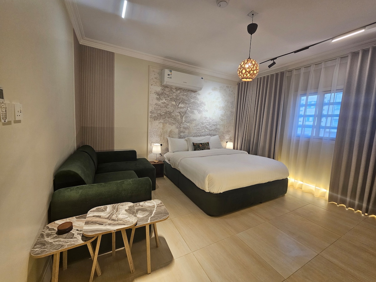 Apartamento de hotel de un dormitorio con sala de estar y balcón con zona de café exclusiva Escápate a este acogedor refugio de un dormitorio diseñado para la comodidad y la elegancia. Ideal para viajeros solteros o parejas, ya que combina la comodidad moderna con un toque de lujo: Cómodo dormitorio con una cama tamaño queen con sábanas suaves y lujosas. Un salón luminoso con un cómodo sofá, una televisión inteligente y una decoración elegante. Balcón privado ideal para tomar el café de la mañana o disfrutar de la puesta de sol. Internet de alta velocidad y un ambiente tranquilo para relajarse o trabajar.