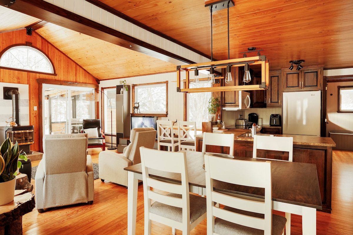 Cabaña con todos los servicios. Encantador lugar a orillas de un pequeño río e incluye acceso al lago Sept-Iles para embarcaciones: 4 kayaks para adultos, 1 para niños y una tabla de paddle surf. Chalet con interior de madera que incluye estufa de gas(en temporada). Techo de catedral en el salón. Muy buen lugar sin importar la temporada. No hay vecinos cerca de la cabaña... ¡Privacidad asegurada! Varios cientos de kilómetros de pistas de ciclismo de montaña a 3,5 km de la cabaña. Número de establecimiento 297777