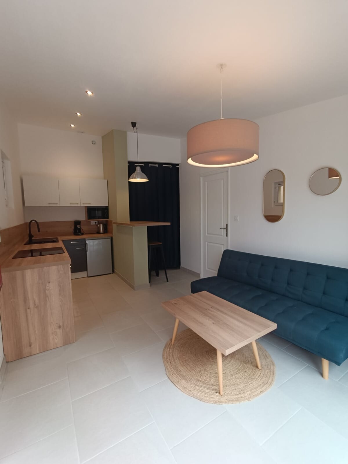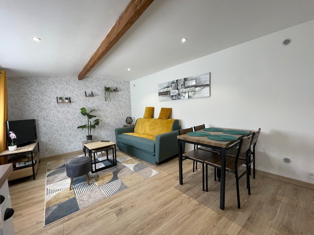 Una pequeña casa independiente y atípica que incluye: - Una pequeña sala de estar con TV y Chromecast. - Una cocina equipada con una estufa, microondas, refrigerador con congelador, fregadero y encimera. - Un pequeño baño con WC (⚠️: La ducha tiene techo inclinado, pero se puede usar sentado si mides más de 1,80 m). - Un dormitorio tranquilo con armario, sábanas incluidas. - Una terraza privada sin vistas directas. Comercios cercanos a 100m (panadería, tienda de comestibles, bares, estanco)."