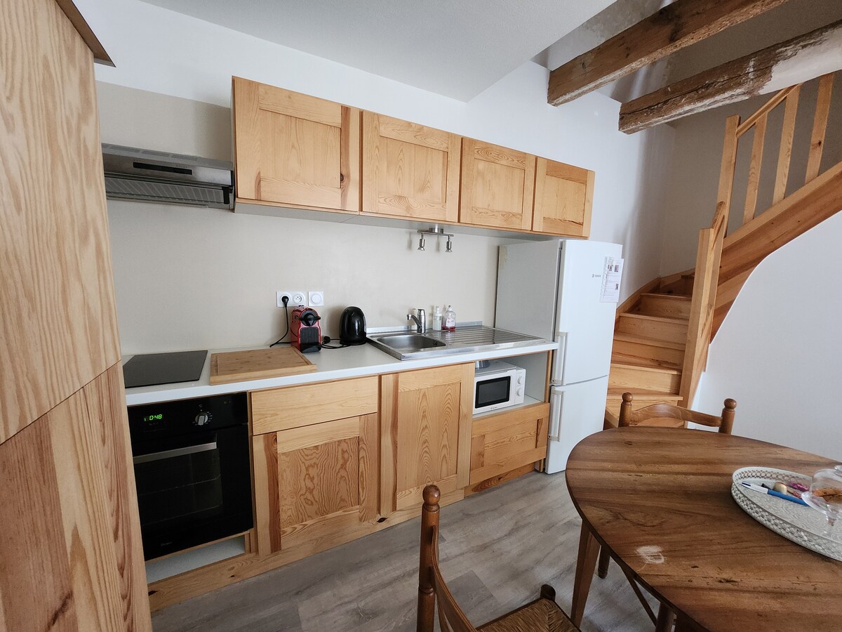 En el corazón del pueblo, en un antiguo convento de los siglos XVI y XVIII, le espera un bonito y acogedor dúplex de 55 m2. Situado en la primera y segunda planta del edificio más antiguo, su gran habitación en un altillo bajo bóveda, es ideal para una pareja. En la sala de estar se puede añadir una cama supletoria para 1 persona. Cuarto de baño y aseo separados, pero es necesario pasar por la habitación. En el patio interior común podrá sentarse a leer o almorzar (mobiliario exterior).