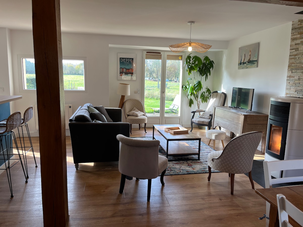 Relájese en este alojamiento tranquilo y elegante. Cerca del mar (8 km). A 300 m de la ruta ciclista del lino, que te llevará a pie o en bicicleta a descubrir los paisajes y pueblos de Normandía. Un jardín privado le da la bienvenida donde podrá relajarse , disfrutar de la barbacoa para comer al aire libre . Los animales son bienvenidos. Cerca de luneray , sus tiendas y el mercado los domingos .
