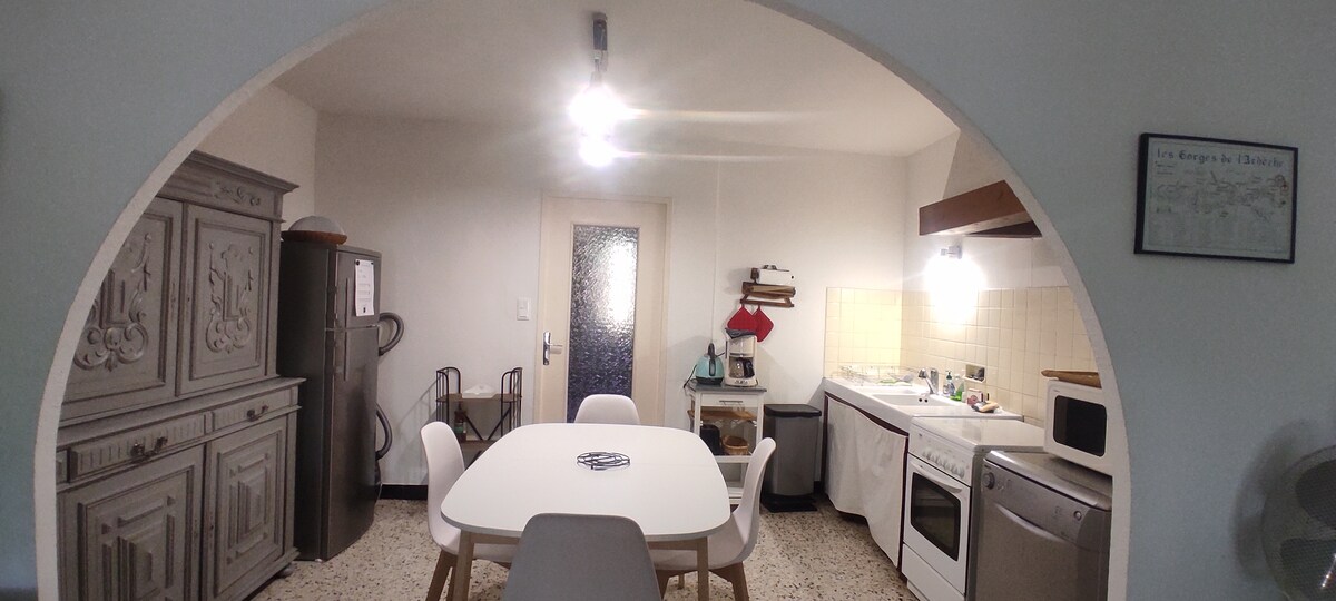 Logement neuf entièrement équipé, terrasse couverte prolongeant sur un extérieur ombragé (salon de jardin, hamac, jeux pour enfants), terrain de pétanque avec sa piscine(ouverture mi-avril). Idéalement situé pour les activités comme les randonnées, le trail, le VTT, le canoë etc... 3 min(1,3km) du centre village, 4 min de Sauze (arrivée descente des gorges de l'Ardèche), proche de la grotte Chauvet, pont d'Arc, pont du Gard, etc.. 45 min d'Avignon(festival), Nîmes(Arène), 1h30 de la mer.