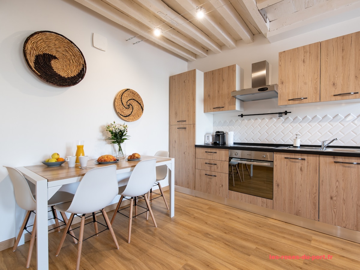 Apartamento espacioso ,cerca de tiendas 5 minutos a pie Ideal para una noche o una estancia para disfrutar de las actividades de los alrededores Situado en un edificio de piedra de 1800 totalmente renovado, cómodo y con aire acondicionado. Una cocina equipada, zona de comedor, espacio de trabajo con wifi Dos dormitorios sofá cama Un baño con ducha italiana Plancha y tabla de planchar Lo más destacado: posibilidad de acceso al espacio privado: spa hammam sauna y tratamientos de belleza con cita previa