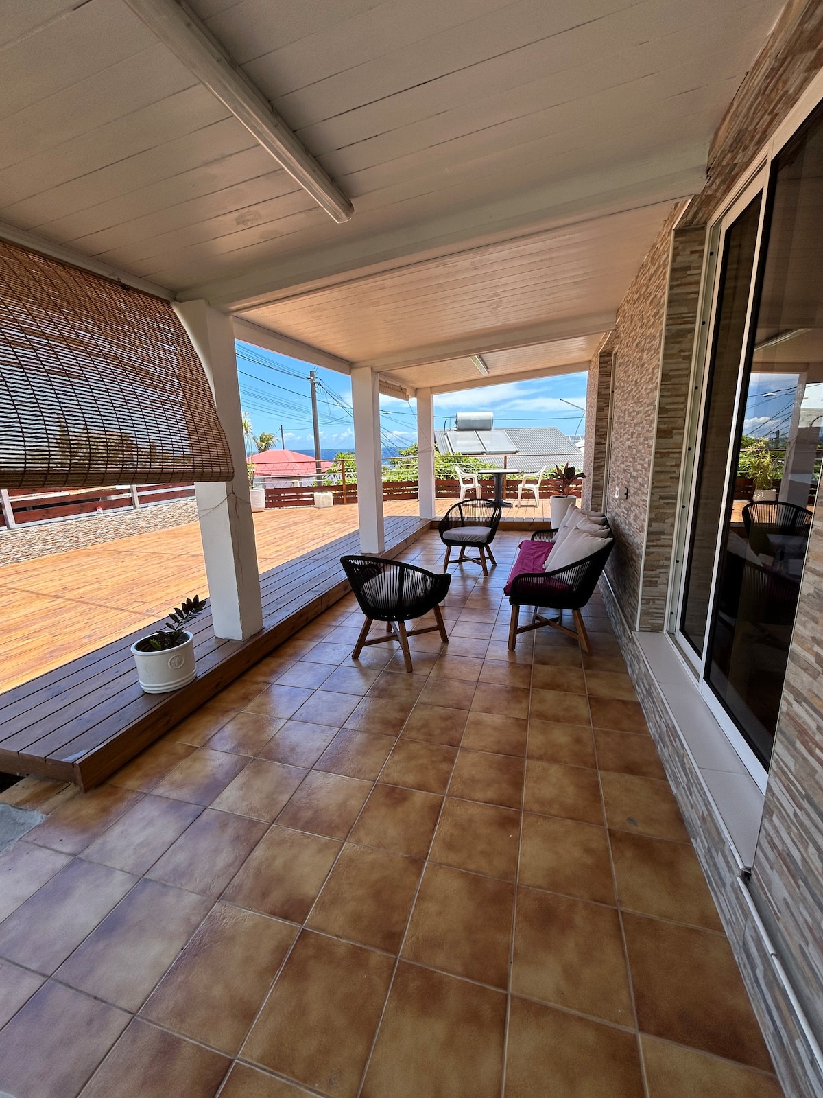 Tikaz Grand Bois en Saint-Pierre, en la unión de los barrios típicos de Terre Sainte, Terre Rouge y Grand Bois... a 5 minutos de la playa más hermosa de la isla, Grand Anse. Vistas al mar, piscina privada, terrazas y jardín, zona de aparcamiento privada y segura. 1 dormitorio con cama de 160 y zona de escritorio. 1 sala de estar con sofá cama (cama de 140 de calidad), gran TV Android, cocina totalmente equipada, zonas de comedor interior y exterior, baño completo.