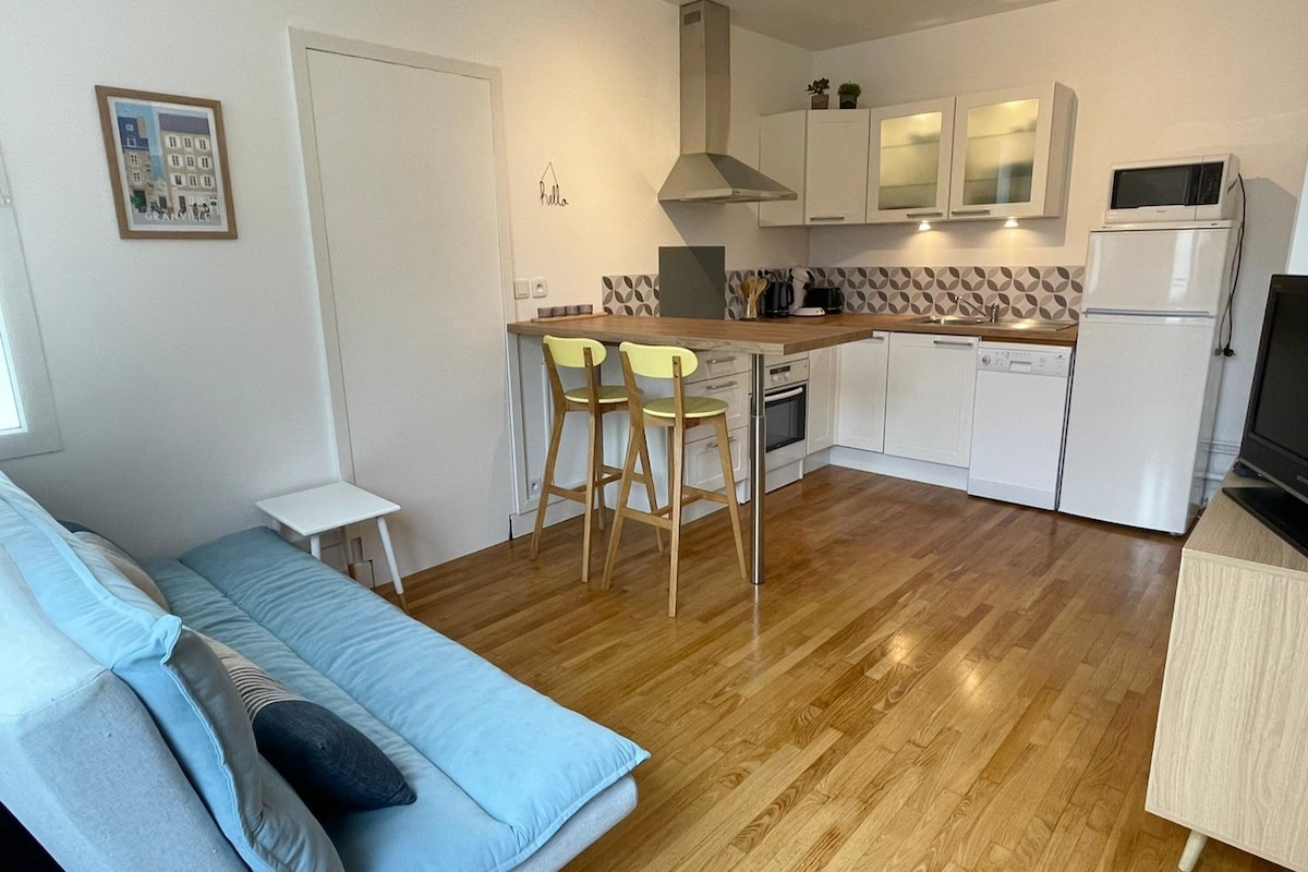 Dúplex con encanto en el primer piso de una antigua casa adosada, a 10 minutos a pie del centro de la ciudad y a 5 minutos a pie de la estación de tren de Granville (París directo en 3 horas desde la estación de Montparnasse). Podrá olvidarse del coche durante su estancia, todo es accesible a pie. Ideal para un viaje a Granville en pareja o en familia. Gran luminosidad transversal. Tendrá acceso a un jardín de flores compartido con el estudio de la planta baja.