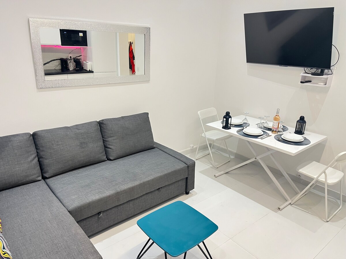 📍 Emplacement premium : à 2 pas de la Place Masséna, tout se fait à pied 🌊 Plages & Promenade des Anglais à moins de 10 min 🛏️ Chambre cosy avec lit queen size + linge de qualité 🛋️ Petit salon lumineux + canapé-lit (idéal couple ou trio) 🍽️ Cuisine ultra équipée (four, LV, LL, café, vaisselle) 🛁 Baignoire pour se détendre après la plage 🌬️ Climatisation + calme en plein centre 🌿 Petit patio pour un souffle d’air frais