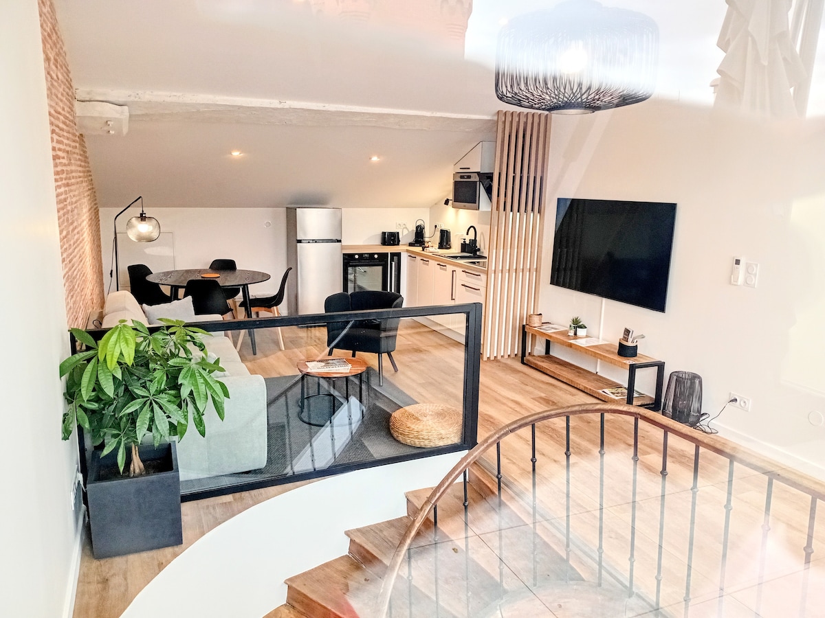 Apartamento T2 de 70 m² en un edificio reformado en el centro de Villeneuve cerca de todos los servicios. Una gran suite (cama de 160x190) en un ático de 30 m² con vistas directas al Lot. Ropa de cama de calidad. Cocina totalmente equipada, (cápsulas Nespresso Veruto incluidas) abierta al salón. Sofá (160x190) convertible en el salón. Amplia terraza con vistas al Lot con vistas al puente viejo y al mercado cubierto de Villeneuve. Alojamiento atípico