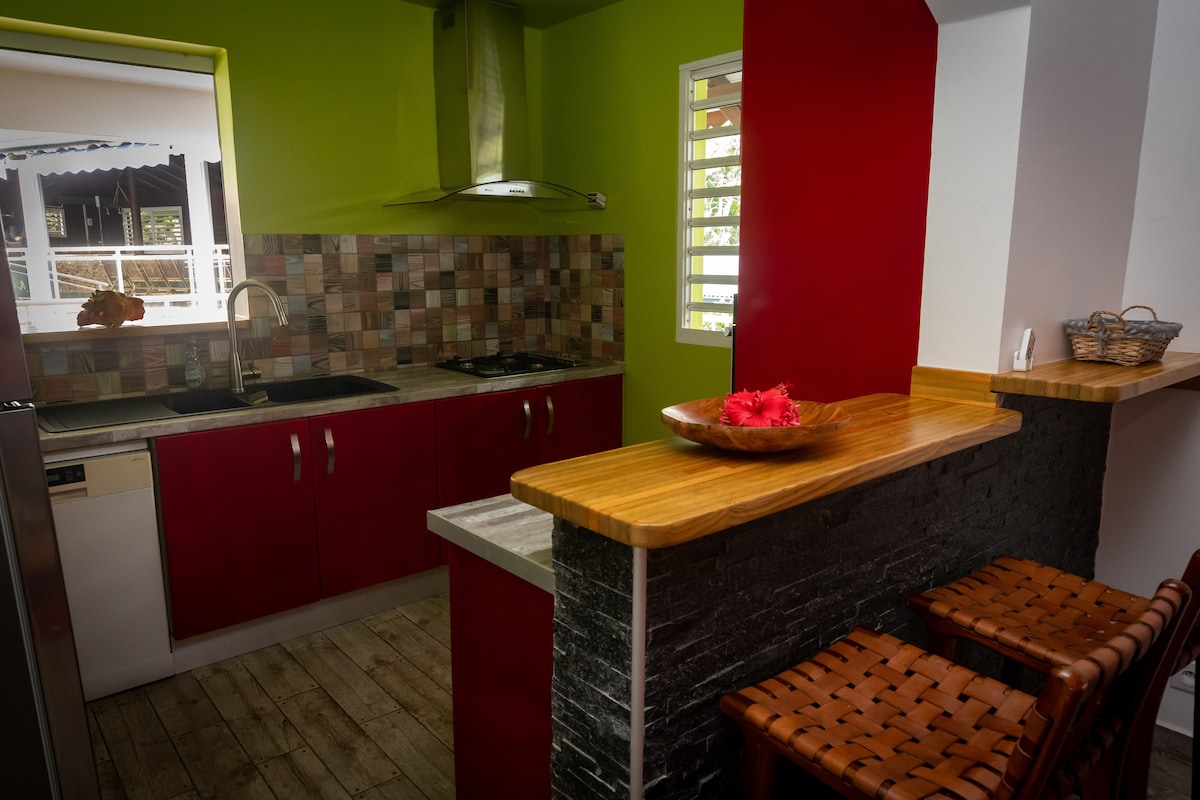 Magnífico apartamento (bajo de la villa) situado en las alturas de Sofaïa en una urbanización tranquila; a 5 minutos del pueblo y a 15 minutos de Deshaies. Este alojamiento es ideal para 4 personas. Cuenta con: - 2 habitaciones con aire acondicionado - 1 baño - 1 cocina totalmente equipada (placa de inducción, lavavajillas, horno pirólisis, microondas, dolce gusto...) - 1 bonita sala de estar con TV (Canal +), conexión Wifi - 1 agradable terraza rodeada de un hermoso jardín arbolado sin enfrente - 1 estacionamiento seguro