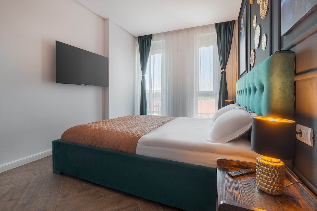Experimenta el lujo en este impresionante apartamento, adornado con tonos oscuros, colores negros y elegantes detalles dorados. La sala de estar de espacio abierto cuenta con un acogedor sofá para 2 adultos, perfecto para relajarse. Disfruta de una cocina totalmente equipada y un dormitorio tamaño king con un elegante baño con ducha a ras de suelo. Sal a tu balcón privado para disfrutar de unas impresionantes vistas de la ciudad. Con estacionamiento reservado y fácil acceso al centro de la ciudad, a solo unos pasos o a 5 minutos en coche, este es el refugio urbano ideal.