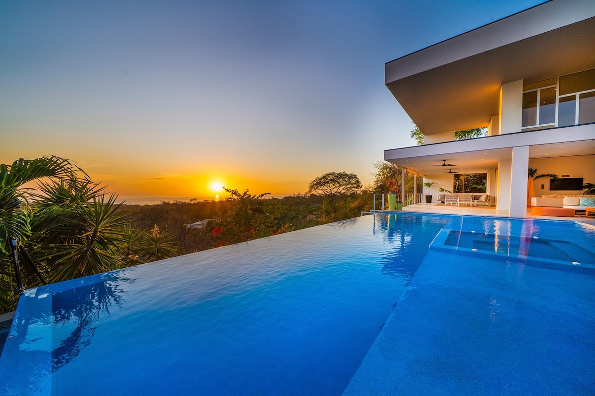 Esta impresionante villa contemporánea con impresionantes vistas al océano Pacífico con vistas a Playa Azul ahora está disponible en alquiler. Esta increíble villa ubicada en las colinas de la zona de Marbella de Costa Rica emana diseño moderno y lujo en su máxima expresión. La casa principal cuenta con 4 dormitorios para ocho personas y 4,5 baños. Al entrar en el alojamiento, uno se siente inmediatamente atraído por las vistas panorámicas del océano. El nivel principal cuenta con la cocina de un chef, un diseño espacioso y abierto para el entretenimiento.