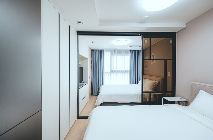 ■ 인원 정보 * 기준 4인:퀸 침대 2개 * 5~8인 예약 시:인원수 맞춤 엑스트라침대 또는 바닥토퍼 설치 및 침구제공 * 24개월 미만 영유아:인원수 미포함(침구 미제공) ■ 숙소 소개 "가족 여행의 품격, 공간의 여유가 차이를 만듭니다" 단순한 숙박을 넘어 완벽한 휴식의 가치를 담은 아비앙또(À bientôt) 해운대 ✨ 아비앙또를 선택해야 하는 이유 ✔ 완벽한 공간 구성 인원이 많아도 기다림 없는 욕실 2개와 넓고 쾌적한 공간 (침실2+욕실2+드레스룸2+거실+주방)전용 30평(98㎡) ✔ 압도적 개방감 2.8m의 높은 실내 층고가 주는 품격 있는 공간감 ✔ 주차 편의 해운대에서 보기 드문 진출입이 편리하고 여유로운 주차장 ✔ 프리미엄 숙면 전 침실 시몬스 매트리스 및 호텔 침구 ✔ 책임 관리 하루 단 한 팀을 위한 전담 직원의 Kärcher진공&스팀 2단계 정밀 케어 함께하는 여유로운 휴식, 아비앙또 해운대에서 즐겨보세요. 또 봐요. 아비앙또.