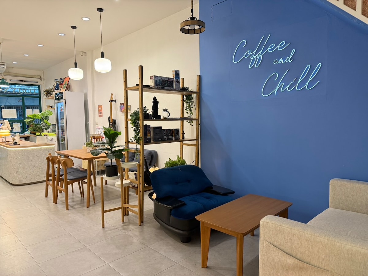 Enjoy a private entire floor with 2 bedrooms and 1 bathroom. One room has a king bed with window, the other has 2 single beds (no window). Bathroom includes a bathtub. The rooms equipped with WiFi and Smart TV. Located above a cozy cafe with a homey vibe. Late check-in available. Just 300m to BTS Udom Suk, 1 stop to BITEC, or under 10 mins by car/motorbike. Easy access to city while staying in a local neighborhood.
