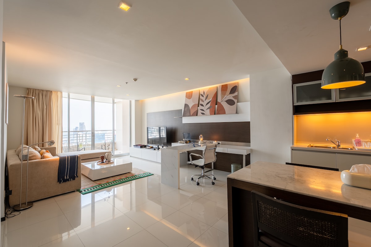 Relájate y contempla la vista en constante cambio del río Chao Praya desde los enormes ventanales del salón y el dormitorio. Disfruta de una puesta de sol y de un paseo hasta el mercado nocturno Asiatique, a solo unos pasos. Situada en uno de los edificios más altos de Bangkok, esta elegante habitación en planta alta con vistas panorámicas ofrece una muestra de la vida urbana local. Los servicios compartidos de primer nivel incluyen una piscina infinita de 360°, gimnasio, cancha de baloncesto, salón panorámico y mucho más.