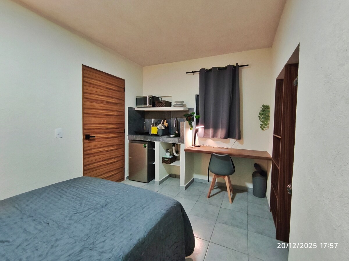 MORADA LIVING Perfecto para amigos, compañeros de trabajo o viajeros que prefieren dormir por separado, este estudio ofrece dos camas individuales, sofá cama, cocina completa, Smart TV y escritorio. Su diseño moderno lo hace práctico y cómodo para estancias cortas o largas. El edificio cuenta con áreas comunes agradables y se encuentra en una ubicación estratégica: cerca del Centro Histórico, Colonia Americana y Parque Agua Azul. Comodidad, flexibilidad y ubicación en un solo lugar.