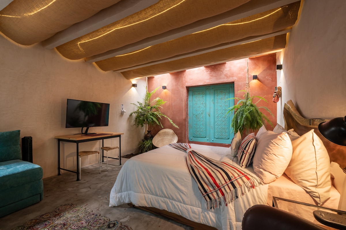 Disfruta de una experiencia única en nuestro encantador alojamiento, a solo una cuadra de la zona arqueológica. El espacio combina confort, estilo y conexión con la historia local. Cuenta con una cómoda cama y un sofá/cama que acomoda a dos huéspedes más. La luz natural se filtra por las puertas turquesa, añadiendo frescura al ambiente. Relájate en el área ajardinada o revitalízate en la ducha tipo lluvia. Con Wi-Fi, cocina equipada, ropa de cama, toallas y entrada con cerradura inteligente.