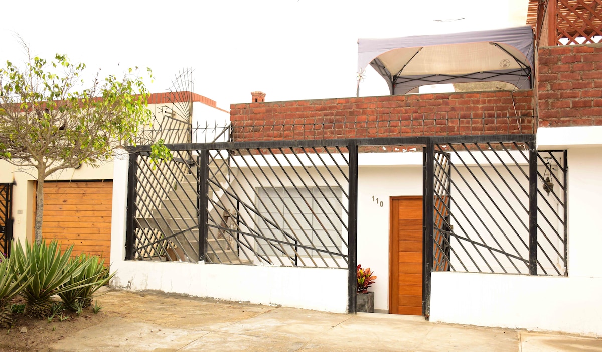 Casa de 2 pisos con piscina, estacionamiento, parrilla y WiFi (Nubyx); ubicada en una zona tranquila a 450m del ingreso a la playa (Playa Norte) [no tiene vista al mar]. Tiene 5 habitaciones, 3.5 baños (2 con agua caliente), cocina equipada, comedor, sala con TV y cable (Movistar), terraza frente a la piscina y 2 espacios amplios ideales para reuniones. Cuenta con 1 estacionamiento en el interior y 2 en el exterior. ¡Aceptamos mascotas! No se permite fumar en interiores.