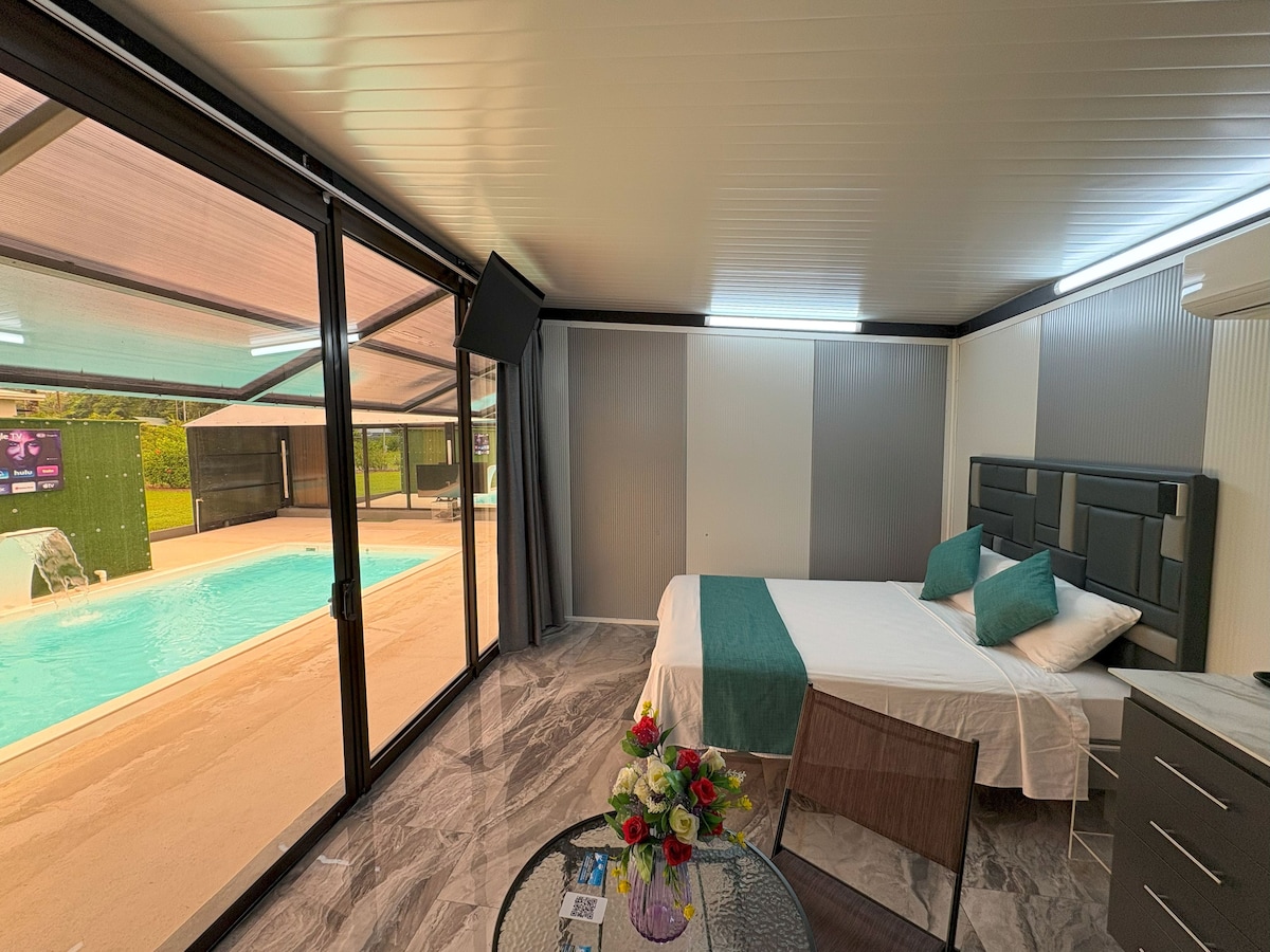 ¡Se pueden hospedar máximo 33 personas! Disfrute junto a su grupo de amigos o familia de toda nuestra propiedad exclusivamente para usted, este alojamiento consta de 5 cabañas y 1 amplia casa, rodeadas de naturaleza, nuestra propiedad cuenta con amplias zonas verdes y el sonar del río Burío que pasa al lado de las cabañas. Tiene acceso a 3 piscinas, rancho BBQ, senderos y áreas recreativas.