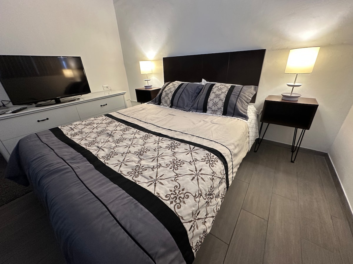 El estilo de mediados de siglo y la artesanía de ambos lados de la frontera abundan en nuestro estudio único de 500 pies cuadrados. Con un oasis privado en el patio trasero, una galería de arte vecina y una ubicación ideal a solo 1,5 millas del centro de la ciudad, nuestro «hotel de 1 habitación» es el lugar ideal para alojarse. NOTA: Vivimos en un barrio urbano y con eso viene algo de ruido urbano. Si lo solicitas, podemos proporcionarte una máquina de ruido blanco y tapones para los oídos. Sin embargo, si tienes el sueño ligero, es posible que nuestro espacio no sea para ti.