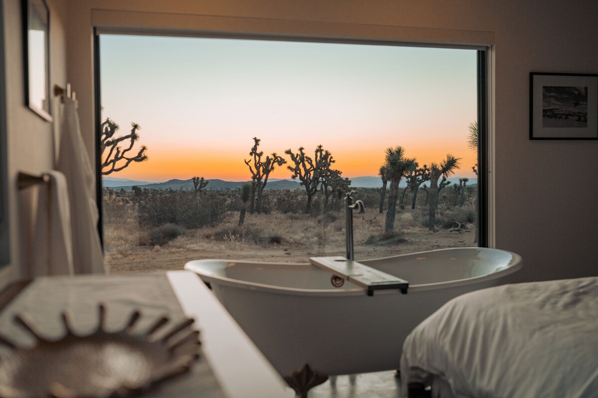 Ubicada en la cima de la Mesa, esta casa de nueva construcción en 10 acres de tierra ofrece vistas al Parque Nacional durante el día y destaca la vasta Vía Láctea por la noche. Sumérgete en la bañera doble con patas de garra y contempla un mar de árboles de Josué o admira el cielo del desierto en el porche trasero mientras las estrellas fugaces se elevan sobre tu cabeza. Si buscas una escapada lejos de las multitudes, pero aún cerca de toda la «diversión» que Joshua Tree y Yucca Valley tienen para ofrecer, no busques más allá de Ladera House.