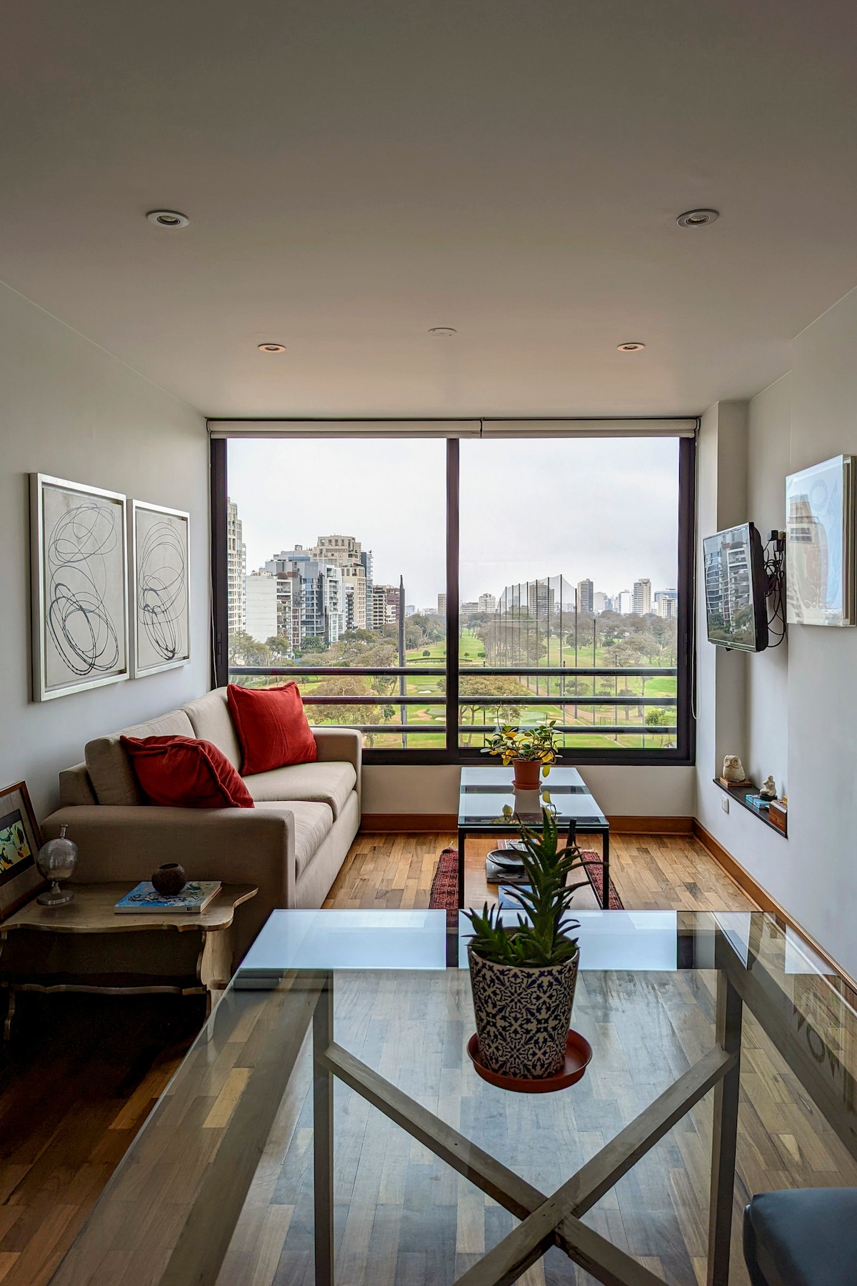 Mira a los jugadores jugar en el hermoso campo de golf de Lima desde la sala de estar de este apartamento contemporáneo. Para disfrutar de vistas atractivas de un tipo diferente, echa un vistazo al arte abstracto de Juan Puente o mira la televisión inteligente de 43 pulgadas desde la comodidad del dormitorio. Y también acceso a internet de alta velocidad wifi. Apartamento equipado (cocina pequeña, sala de estar, dormitorio principal con cama doble y baño dentro de la habitación). El apartamento tiene una vista increíble al entrar y te deleitará con una gran zona verde (Lima Golf Club) desde la sala de estar y el dormitorio principal. Tanto el dormitorio como la sala de estar tienen TV. Departamento equipado, (cocina pequeña, sala, comedor, dormitorio principal con cama matrimonial y baño dentro de la habitación). El departamento tiene una vista espectacular desde que entras y te deleitará desde la sala y la habitación con una gran área verde (Lima Golf Club). El dormitorio y la sala tienen televisor. Con mucho gusto guiaré a los huéspedes y responderé a sus preguntas y requisitos para que su estancia en Lima sea lo más cómoda posible. Con gusto guiaré al huésped y atenderé las consultas y requerimientos para que la estadía en Lima sea lo más cómoda posible. El apartamento está en San Isidro, considerada la zona más exclusiva y segura de Lima. Está a solo cinco manzanas de Miraflores, cerca de las principales zonas financieras, tiendas exclusivas, los mejores restaurantes, bares, teatros y cines. La forma más sencilla de desplazarte por Lima es en taxi. Las aplicaciones Uber y Easytaxi funcionan perfectamente en Lima. No sugiero usar el transporte público a menos que te muevas por cerca. Alrededor del apartamento hay muy buenos restaurantes, bares, teatros y supermercados a 10 minutos a pie. La manera más fácil de moverse por Lima es en taxi. Las aplicaciones Uber y Easytaxi funcionan perfectamente. No sugiero usar el transporte público salvo para moverse en distancias cortas. A menos de 10 minutos caminando alrededor del departamento hay muy buenos restaurantes, bares, cines y supermercados. En Lima hay mucho tráfico en las horas punta de 8:00 a 10:00 y de 17:30 a 20:00, se recomienda utilizar Waze o (CONTENIDO CONFIDENCIAL OCULTO) para llegar a tiempo al destino. En Lima hay mucho tráfico en las horas punta de 8:00 a 10:00 y de 17:30 a 20:00, se recomienda utilizar Waze o (CONTENIDO CONFIDENCIAL OCULTO) para llegar a tiempo a tu destino.