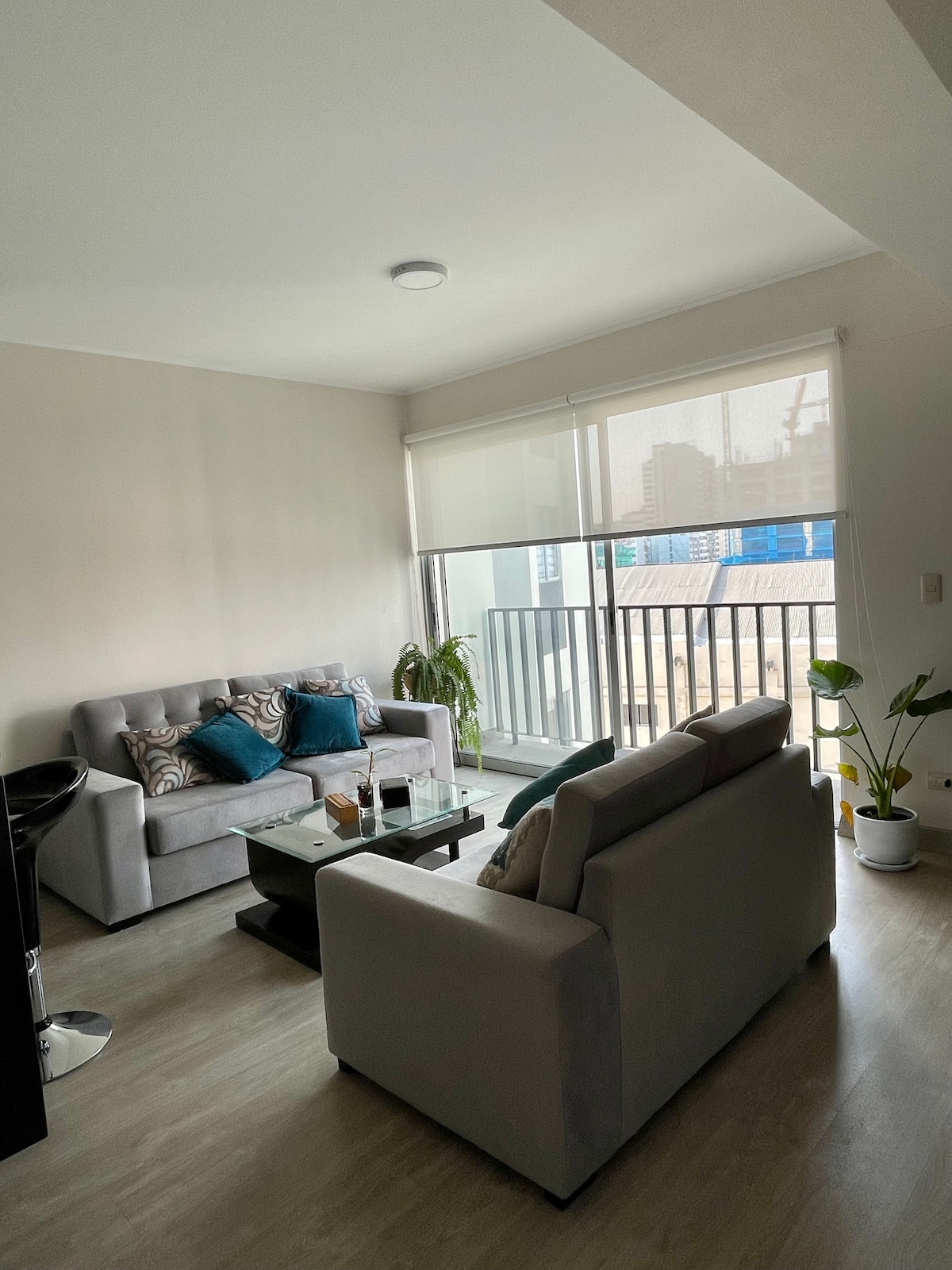 Es un apartamento cómodo, ubicado en el centro de miraflores a 1 cuadra del malecón, muy cerca a restaurantes, centros comerciales (larcomar), lugares turísticos, playas, entre otros. De 90 m2 de amplitud con 1 cama, 1 baño completo y 1 medio baño, 1 cocina, sala y comedor. El apartamento está en un sexto piso con ascensor. Un lugar muy acogedor y en uno de los distritos más importantes de Lima.