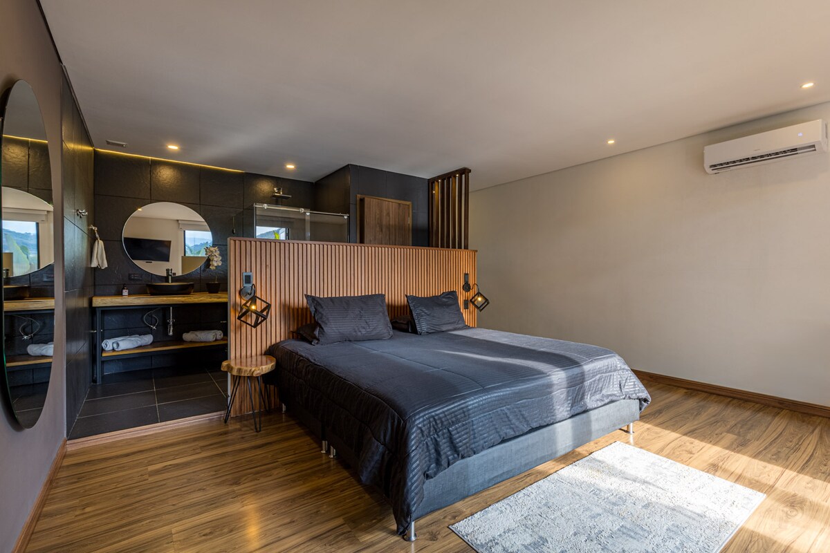 Enjoy luxury and comfort in our exquisite suite, just a stone's throw from Santafé de Antioquia. Upon entering the suite, you will be greeted by a spacious and elegantly furnished living room with a cozy sitting area and a flat screen TV. The suite features a comfortable king-sized bed, dressed in plush bedding, promising a restful night's sleep. The highlight of the suite is the private Jacuzzi, where you can unwind and relax after a day exploring the picturesque surroundings.