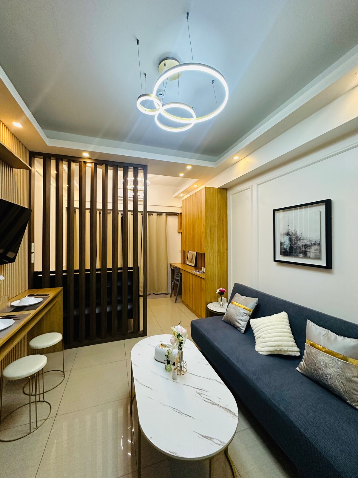 Welcome to Casa Luna Mnl, a 32sqm. studio unit on 38th floor located in Novotel Suites at Acqua Private Residences, Mandaluyong City - a Modern Chic Boho-Scandi Urban Sanctuary - where style meets comfort. With a breathtaking view of Rockwell's iconic city lights and Makati's cityscape, it is a perfect space for creating memories with your family, one stay at a time. Whether for business or leisure, experience comfort and convenience in a condo-style right in front of your doorstep.