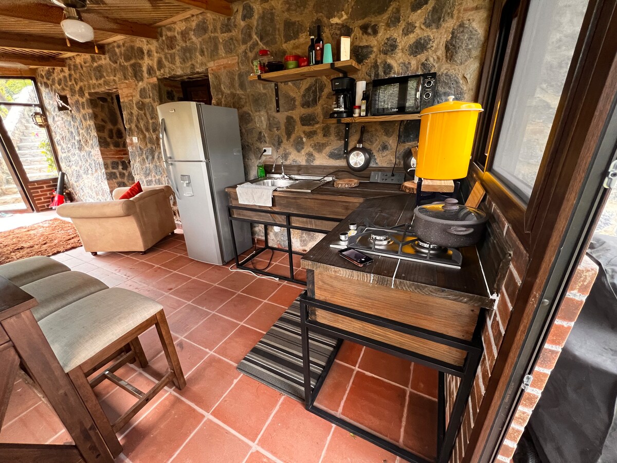 La casita de piedra forma parte de un complejo de cabañas de lujo, completamente equipadas, para disfrutar en pareja o en familia, ubicadas a tan solo 1 kilómetro de un centro comercial donde puedes encontrar supermercados y restaurantes, y a dos kilómetros de la ciudad colonial de Antigua. Este combina ambientes construidos de vidrio, madera y piedra, lo que lo hace especial y acogedor, ofreciendo una experiencia única y privada, lo recomendamos para parejas!